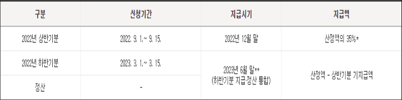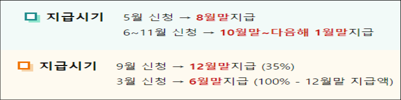 가장 궁금해하시는 것이 지급시기인데요, 정기신청은 8월 말에 지급되고, 상반기 신청은 12월 말 산정액의 35% 지급, 하반기 신청은 6월 말 산정액에서 상반기분 지급액을 뺀 나머지를 받을 수 있습니다.