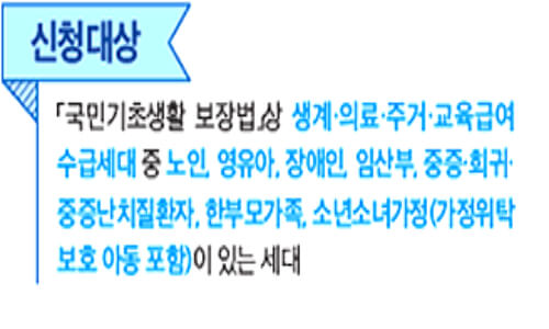 기초 수급자 에너지 바우처 신청대상은 국민기초생활 보장법에 따른 생계급여, 의료급여, 주거급여, 교육급여 수급세대 중 아래에 해당사항이 있을 시 신청이 가능합니다.