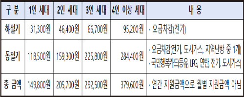 지원금액은 세대원수를 고려하여 차등지급 되는데 이는 월간지원금액이 아닌 연간 지원금액입니다.