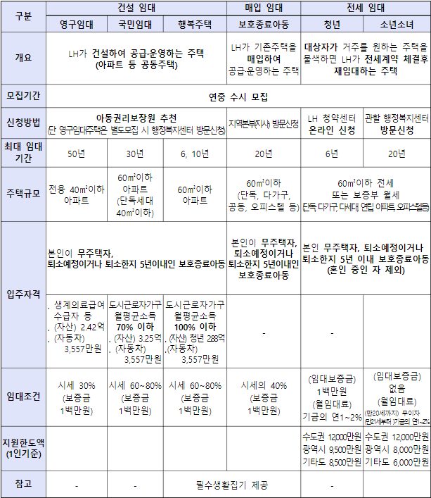 - 건설임대주택: LH가 건설하여 공급. 운영하는 공동주택. 아동권리보장원 추천 대상자 무주택 등 입주자격을 충족할 시 최장 30년 거주가능