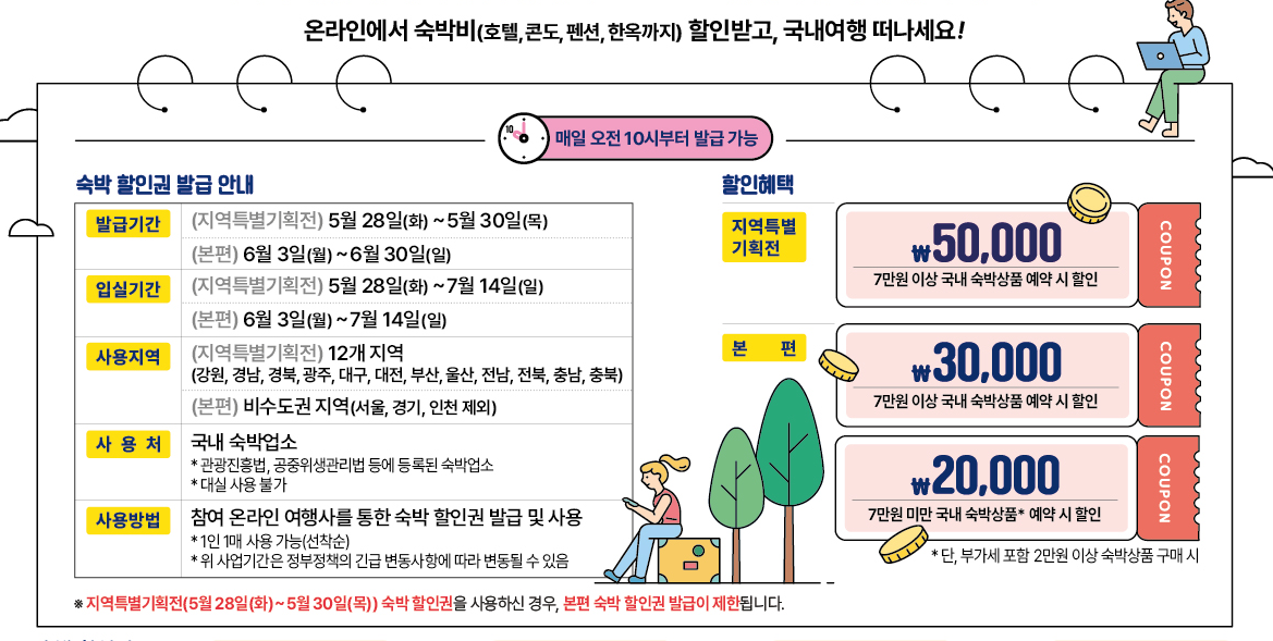 문화체육관광부에서 비수도권의 지역 활성화를 위해 5월 28일부터 숙박할인권 25만 장을 배포합니다. 매일 오전 10시부터 1인 1매 선착순으로 발급되니 여행을 계획하고 계신 분들은 서둘러서 할인권을 받으시기 바랍니다.